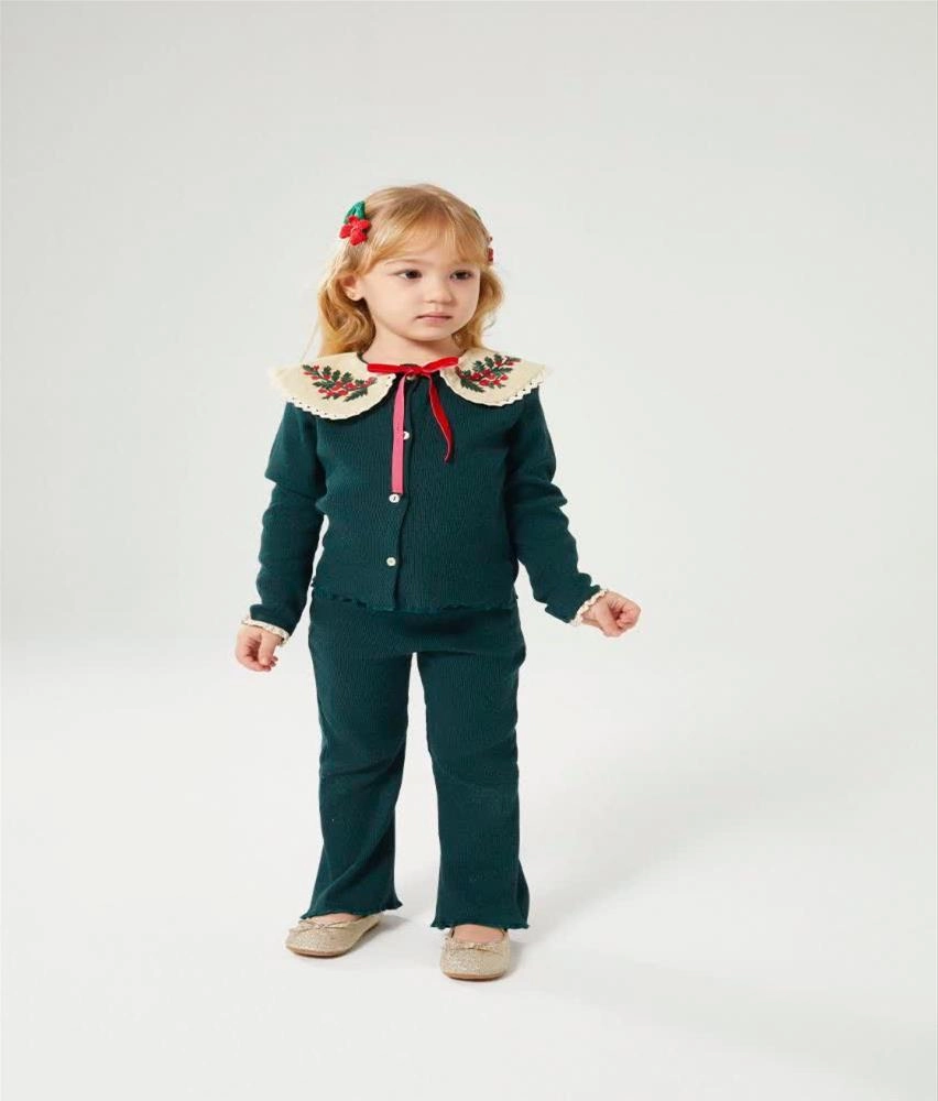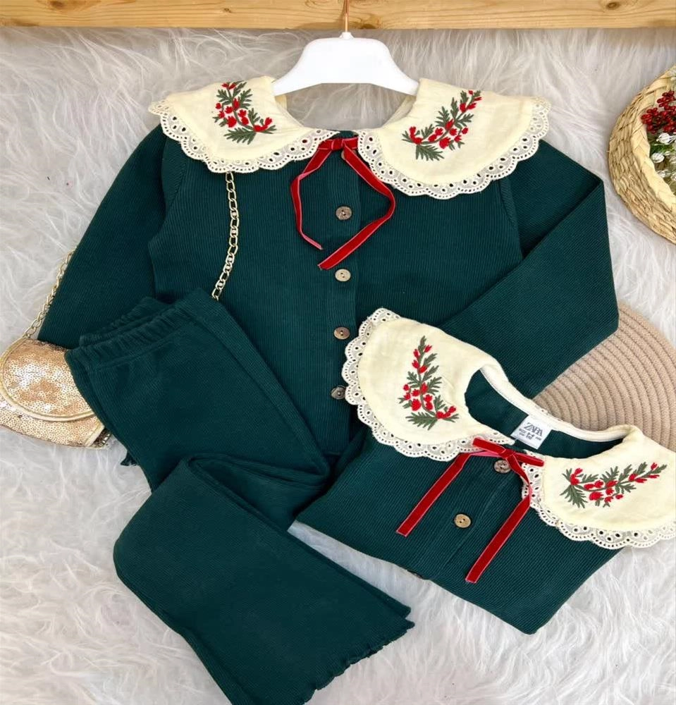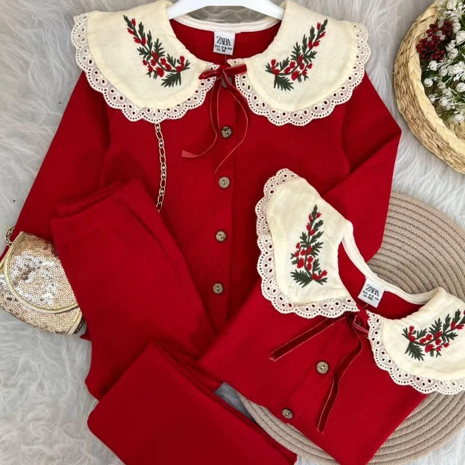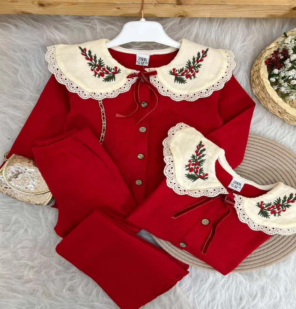 تکرار دوتیکه ست کبریتی یقه گلدوزی دکمه دار و شلوار دمپا زارا ترک کد 6250