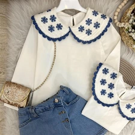 دوتیکه بلوز یقه گلدوزی و دامن شلوارکی جین ترک کد 6283